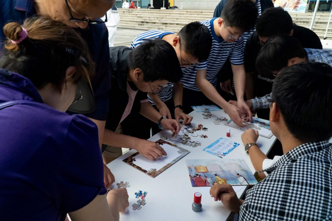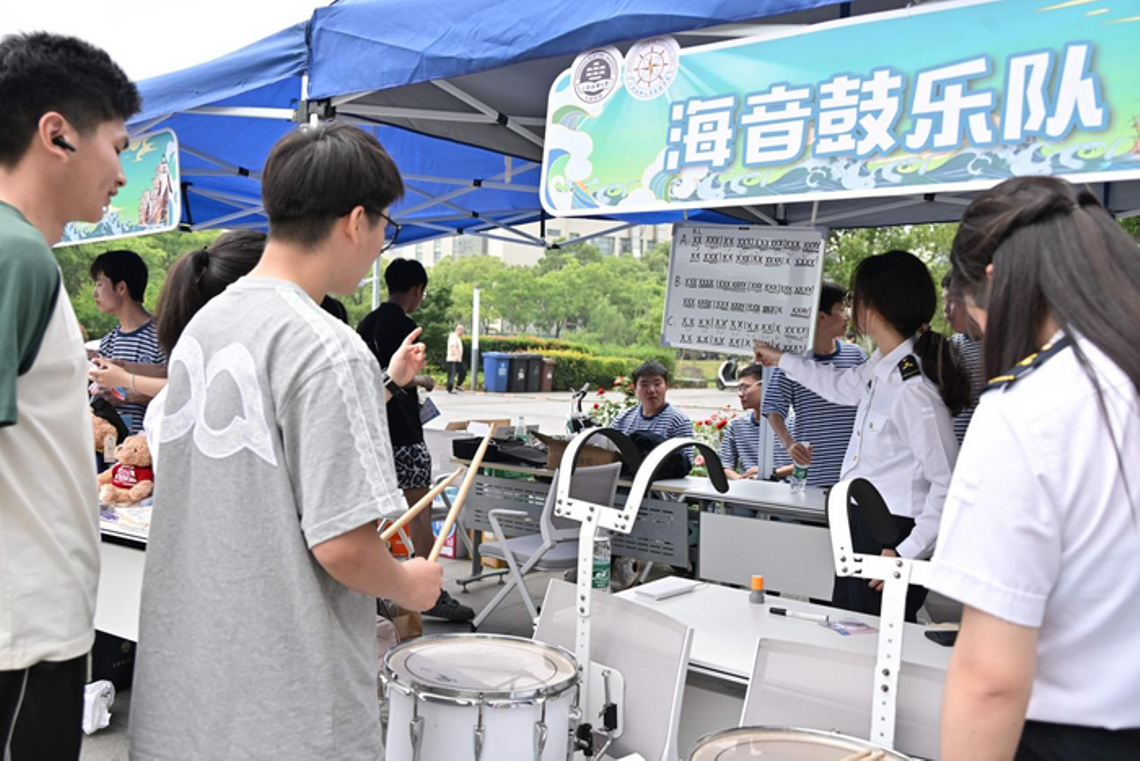 在活动现场,商船学院九大社团融合历史与现代元素,带来丰富的特色体验活动。海蓝仪仗队以队列表演、装备讲解展现航海仪式感,师生通过体验正步走、持枪礼感受仪式的庄重和严肃;云帆旗语队开设“郑和航海旗语”课堂,传授“起航”、“安全”等实用旗语;海音鼓乐队带来鼓乐表演与军鼓文化宣讲,观众可跟随队员学习基础鼓点;水手工艺社展示“郑和航海绳结”编织技艺,演示单套结、称人结等实用绳结;船长英语角模拟郑和船队涉外场景,通过角色扮演提升学生跨文化沟通能力;吴淞特种船研究社开展“郑和船队识船达人”挑战,结合模型竞猜与历史讲解;WM夜跑团设置“航海力量”体能挑战,通过哑铃体验与科学拉伸增加挑战丰富度;微尘志愿者服务队组织“郑和宝船”拼图制作,传递动手乐趣与历史魅力;OM科创协会与船舶与海洋工程学会设立“航海知识加油站”,开展趣味问答,寓教于乐。此外,现场还有工作人员化身“郑和”现身互动,与游客开展郑和知识问答与故事分享,进一步增强了师生和游客对郑和其人其事的认识与理解。本次活动还特别设置集章打卡环节,师生转发活动信息并集赞即可领取集章卡,通过完成各社团互动挑战集章后,可抽取航海精美纪念品。从旗语破译到绳结竞猜,多样互动让航海文化深入人心。​